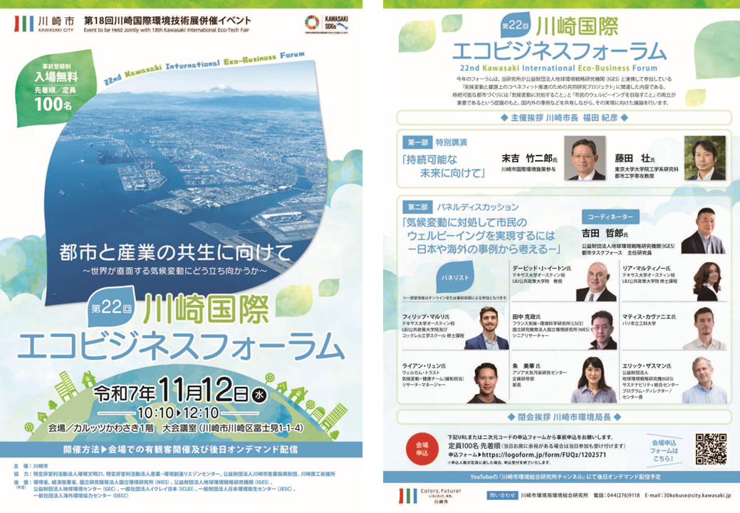 アジア大気汚染研究センター 企画研修部長朱美華氏が川崎市の招聘を得て、第22回川崎国際エコビジネスフォーラムに参加します。今年のフォーラムでは、『都市と産業の共生に向けて-世界が直面する気候変動にどう立ち向かうか-』をテーマに開催いたします。公益財団法人地球環境戦略研究機関(IGES)と連携して参加している「気候変動と健康上のコベネフィット推進のための共同研究プロジェクト」に関連した内容である、持続可能な都市づくりには「気候変動に対処すること」と「市民のウェルビーイングを目指すこと」の両立が重要であるという認識のもと、国内外の事例などを共有しながら、その実現に向けたパネルディスカッションを行います。